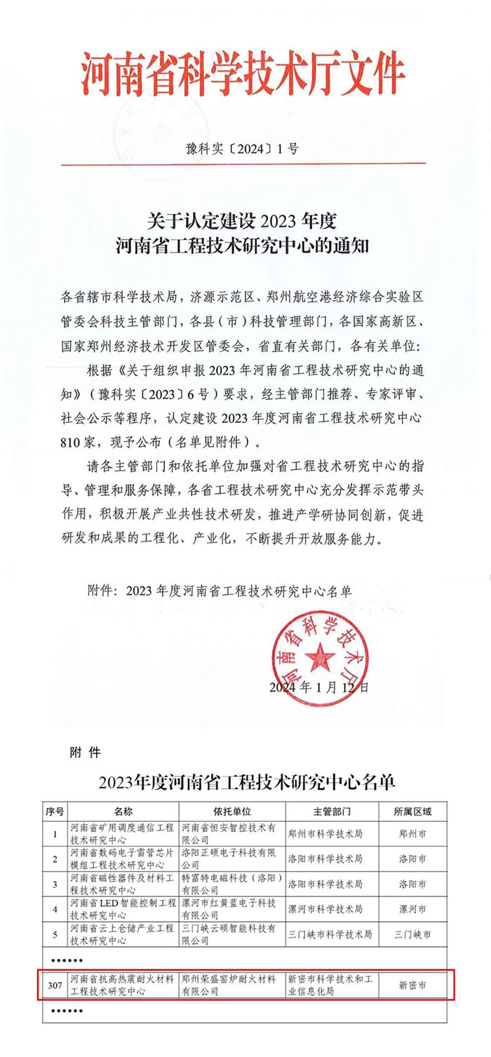 近日,河南省科學(xué)技術(shù)廳發(fā)布了《關(guān)于認(rèn)定建設(shè)2023年度河南省工程技術(shù)研究中心的通知》。經(jīng)申報(bào)、主管部門推薦、論證和研究等程序,鄭州榮盛窯爐耐火材料有限公司(以下簡(jiǎn)稱“榮盛耐材”)申報(bào)的“河南省抗高熱震耐火材料工程技術(shù)研究中心”正式獲批。