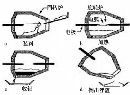 ALUREC法由丹麥阿加公司、霍戈文斯鋁業(yè)公司、曼公司三家公司聯(lián)合開發(fā),流程圖見圖4。主要流程為裝料、加熱、收鋁、倒出浮渣,該法主體設(shè)備為回轉(zhuǎn)式熔化爐,還可以用純氧作助燃劑,升溫速度快,可以有效減少燃燒過程產(chǎn)生的有機(jī)氣體,煙塵被煙罩吸收二次利用處理。此法優(yōu)點(diǎn)在于機(jī)械化程度較高和運(yùn)行環(huán)境好;但金屬回收率要比炒灰低,一般在93%左右,且產(chǎn)生的殘余鋁灰還需進(jìn)一步處理。