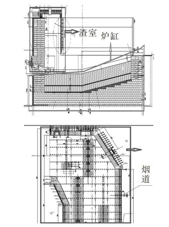 由側(cè)吹爐工作原理可知,側(cè)吹爐爐缸、渣室會(huì)受到熔體的侵蝕和沖刷,煙道會(huì)受少量熔渣的噴溉侵蝕和含塵煙氣的沖刷。在正常爐況下,這3個(gè)區(qū)域的溫度為1100~1300℃;但在爐況不穩(wěn)定情況下,這3個(gè)區(qū)域的溫度可達(dá)1400℃以上。在實(shí)際生產(chǎn)過(guò)程中,側(cè)吹爐需供入富氧1次風(fēng)和2次風(fēng),并在局部形成強(qiáng)氧化氣氛,因此側(cè)吹爐應(yīng)選擇不易被氧化的耐火磚。熔渣的主要成分為FeO、SiO?、CaO、AI?O?,高鋁質(zhì)耐火材料和硅石耐火材料會(huì)參與造渣,不適合側(cè)吹爐使用。因此,側(cè)吹爐耐火材料需要具備耐高溫、熱穩(wěn)定性強(qiáng)、荷重變形溫度高、耐壓強(qiáng)度高、抗氧化性、不參與造渣的特點(diǎn)。結(jié)合耐火材料的特性,側(cè)吹爐應(yīng)選擇鎂質(zhì)耐火材料。鎂質(zhì)耐火材料中Cr?O?的含量増加可以提高材料的抗渣侵蝕性,因此側(cè)吹爐爐缸、渣室和煙道的耐火磚選擇Cr?O?含量較高的鎂鉻質(zhì)耐火材料。