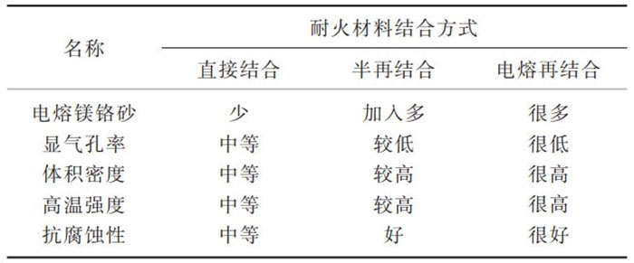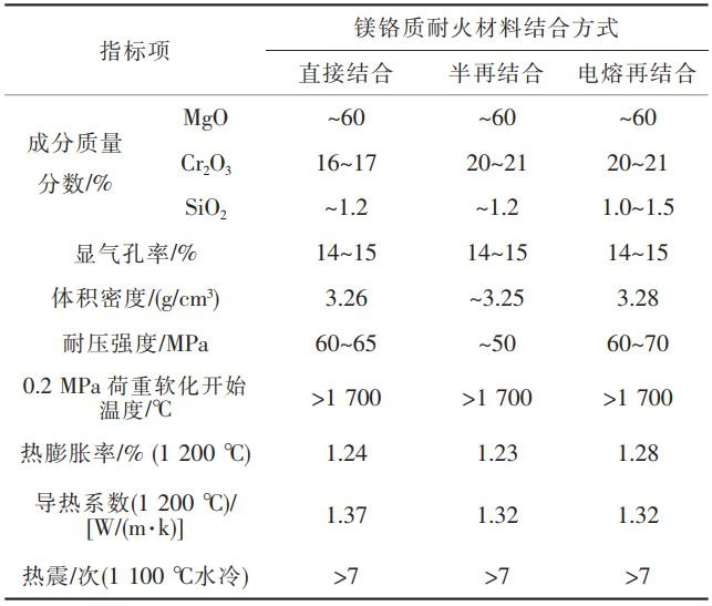 根據(jù)鎂鉻質(zhì)耐火材料的結(jié)合形式的不同,包括直接結(jié)合、半再結(jié)合、電熔再結(jié)合等鎂鉻質(zhì)耐火材料。其中,直接結(jié)合鎂鉻質(zhì)耐火材料是以高純燒結(jié)鎂砂和鉻鐵礦為原料,將電熔鎂砂與鉻礦直接燒結(jié);半再結(jié)合鎂鉻質(zhì)耐火材料是以電熔鎂鉻砂作屬粒,加入部分鉻礦和鎂砂或燒結(jié)合成鎂鉻料作細(xì)粉,高溫?zé)Y(jié)而成;電熔再結(jié)合鎂鉻質(zhì)耐火材料是將鉻礦與電熔鎂砂在電爐中電熔,制得電熔鎂鉻砂,再高溫?zé)Y(jié)而成。3類(lèi)鎂鉻質(zhì)耐火磚材料特性對(duì)比,見(jiàn)表1。
