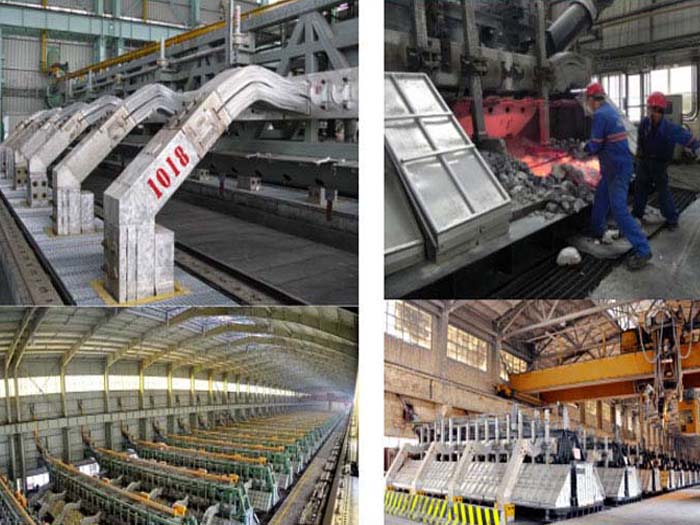 鋁電解槽通常為矩形鋼殼,內(nèi)襯碳磚。電解槽中懸有一碳陽ji,其碳質(zhì)槽底為陰ji。電解還原出來的金屬鋁熔體沉積于槽底陰ji。陽ji放出的氧與碳陽ji反應(yīng)生成CO與CO2。槽內(nèi)電解質(zhì)與鋁保持熔融狀態(tài),隔一定時間從槽內(nèi)放出鋁液,并向槽內(nèi)加入一定量的Al2O3與冰晶石(3NaF.AlF3)等。電解溫度為900~1000℃。