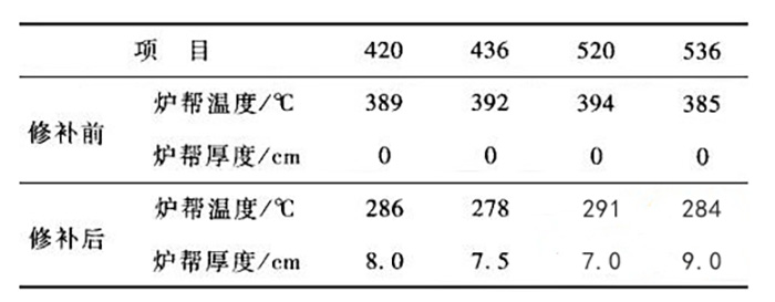 電解槽側(cè)部內(nèi)襯破損部位修補(bǔ)前后爐幫溫度及爐幫厚度的測量對比分析結(jié)果見表2。
