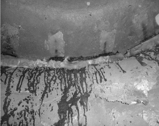 3、耐磨可塑料施工。可塑料敷設(shè)在施工構(gòu)件上后,用木錘或橡皮錘搗打密實。塊與塊之間的接縫也應(yīng)搗打密實,使接縫嚴(yán)密,將表面壓光、壓平。所施工部位與原來墻體接縫處應(yīng)確保平滑過渡,不得凹進(jìn)或凸出。用磷酸鋁溶液浸泡硅酸鋁纖維板封堵膨脹縫,避免鍋爐運(yùn)行過程中出現(xiàn)竄風(fēng)現(xiàn)象,導(dǎo)致非金屬補(bǔ)償器燒損。耐磨可塑料施工完畢后的膨脹縫封堵如圖4所示。