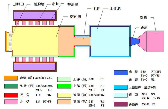 為了減少死角,以利于玻璃液的流動,我們將熔化池的前池墻磚體設計為八字形。